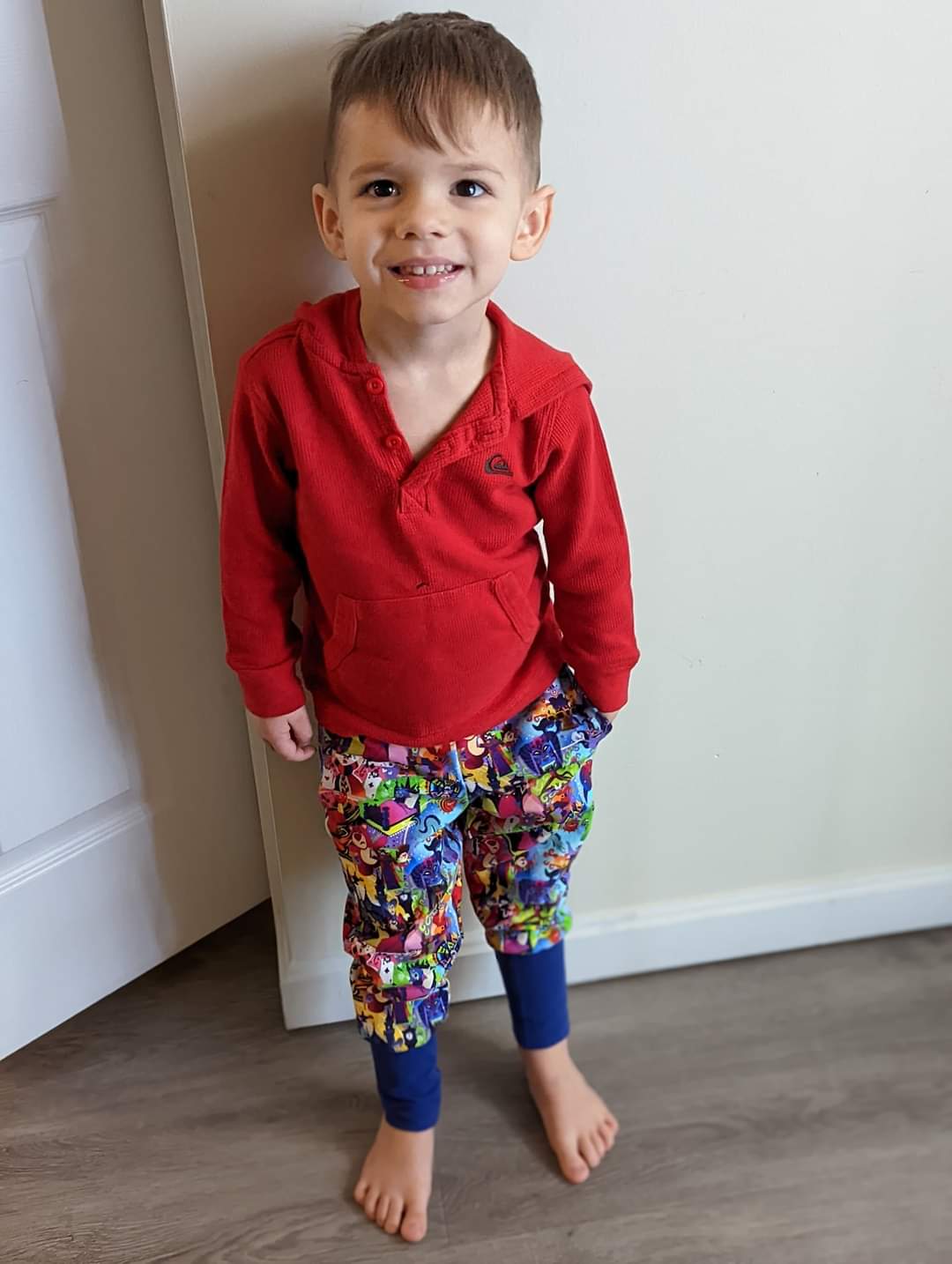 These Pants are “Grow With Me” style! To make them the smallest size, simply fold down the waist band and fold up the leg cuffs 1-2x!